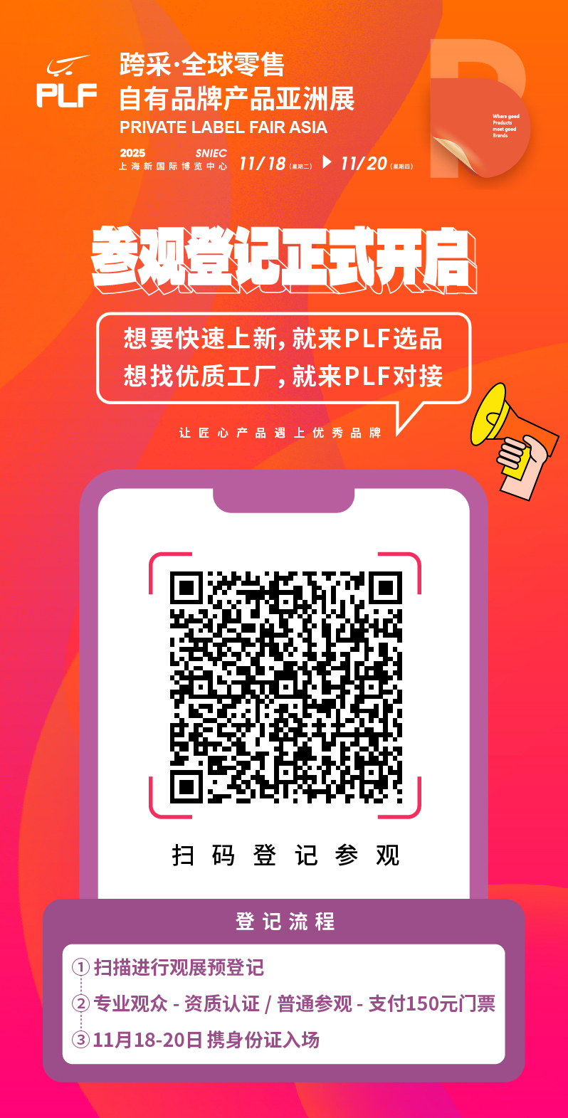 跨采· 第十八届全球零售自有品牌产品亚洲展(PLF)将于2025年11月18-20日在上海新国际博览中心盛大召开。本届展会展出面积 6万平方米,集结了涵盖家居日用、个人护理、文体3C、休闲零食、酒饮冲调、民生食品、保健食品等品类参展商近千家,源头实力工厂集中亮相!目前,PLF展会预登记已开启,欢迎专业观众前来登记注册,方便快速入馆观展!